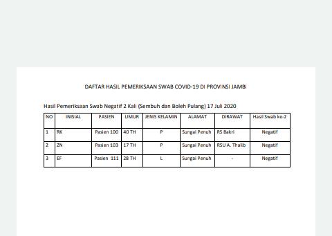 Berdasarkan data tersebut, 3 orang pasien positif Corona asal Sungai Penuh dinyatakan sembuh, dan diperbolehkan pulang ke rumahnya.