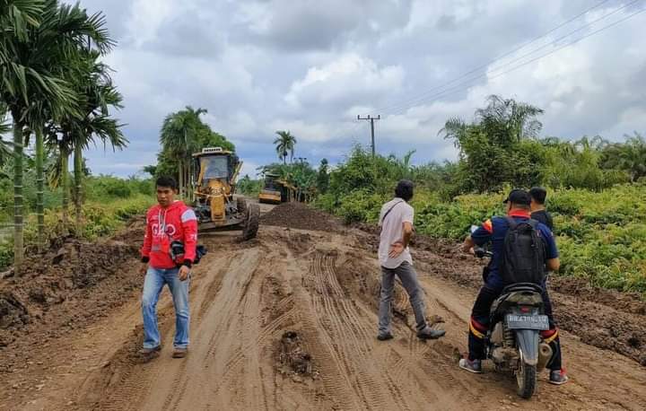 Beberapa pekerja yang merupakan karyawan PTPN VI Unit Usaha Lagan tampak mengatur truk dan alat berat Bomag, maju mundur memadatkan jalan menuju Ibukota Kecamatan Mendahara, Tanjab Timur itu.
