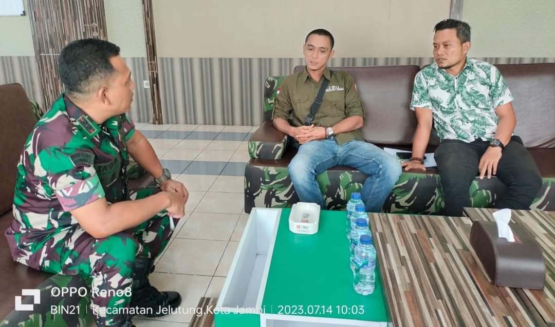 JAMBI – Komandan Kodim (Dandim) 0415/Jambi Letnan Kolonel Arm Eko Pristiono SH menerima audiensi Pengurus Wilayah (PW) Ikatan Wartawan Online (IWO) Jambi di Makodim 0415/Jambi, jalan Untung Suropati, Jelutung, Kota Jambi, Jumat (14/7/2023).