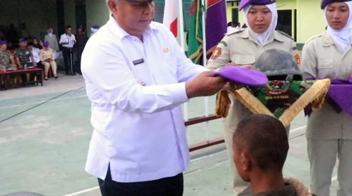 TANJABBAR – Bupati Tanjabbar Dr. Ir. H Safrial MS Resmi menutup kegiatan diksar Resimen Mahasiswa Sulthan Thaha Jambi Ke XII Se provinsi jambi tahun 2019, dengan menyematkan baret ungu di Makodim 0419/Tanjab.