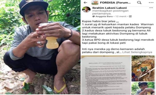 Sambil memegang botol bekas minuman, yang berisi air keruh. Serta foto tersebut di duga jika ketua Badan Permusyawaratan Desa (BPD) sedang menggunakan narkoba jenis sabu-sabu di dalam semak belukar yang di duga lokasi PETI.