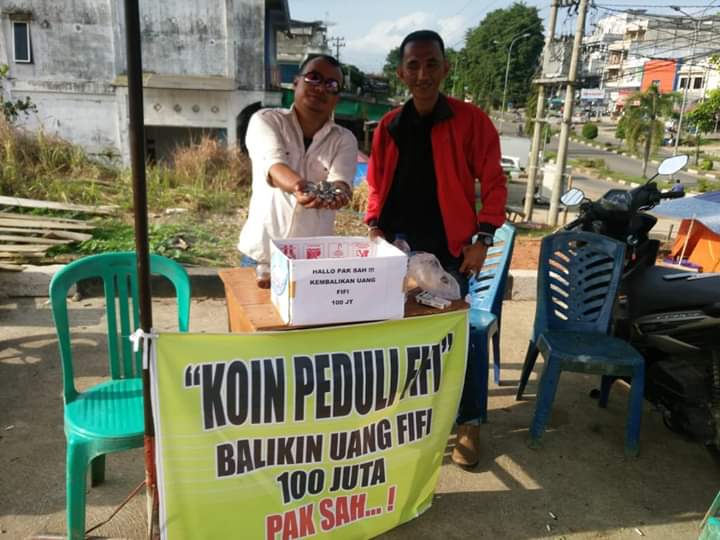 Spanduk bertuliskan ‘Koin Peduli Fifi’ Balikin uang fifi 100 Juta pak SAH, menghiasi posko aksi koin peduli Fifi.