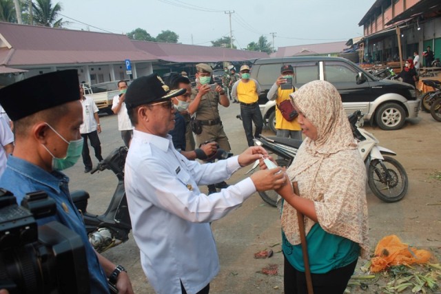 Jambi – Guna mengantisipasi dampak kabut asap akibat kebakaran hutan dan lahan (Karhutla), Gubernur Jambi, Dr Drs H Fachrori Umar, M.Hum, turun langsung ikut membagikan masker kepada masyarakat dan pedagang di Pasar Angso Duo yang baru, Jambi, Rabu (18/09/2019) pagi. Ada 5.000 masker yang diberikan secara gratis kepada masyarakat, dan secara simbolis, gubernur membagikan ke beberapa orang warga.