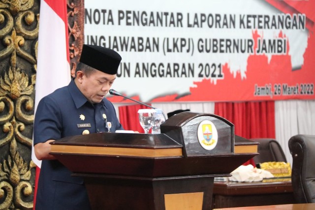 JAMBI – Gubernur Jambi, Al Haris menyampaikan nota pengantar Laporan Keterangan Pertanggungjawaban (LKPJ) Tahun Anggaran 2021 pada Rapat Paripurna, Sabtu (26/3/22).