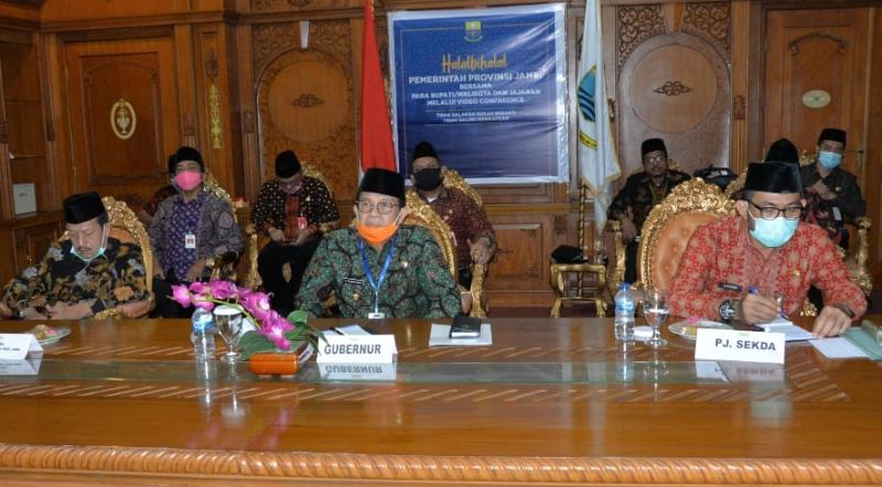 JAMBI – Halal Bihalal Pemprov Jambi, Gubernur Fachrori Umar via Vidcon dengan bupati/walikota, Kamis (28/05/2020) sampaikan pesan Covid-19