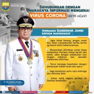 Senin (2/3) Gubernur Jambi, Dr Drs H Fachrori Umar,M.Hum imbau semua pihak, semua masyarakat Provinsi Jambi untuk meningkatkan kesiagaan terhadap Virus Corona. Namun, Fachrori mengemukakan agar dalam meningkatkan kesiagaan tersebut, masyarakat tidak panik.