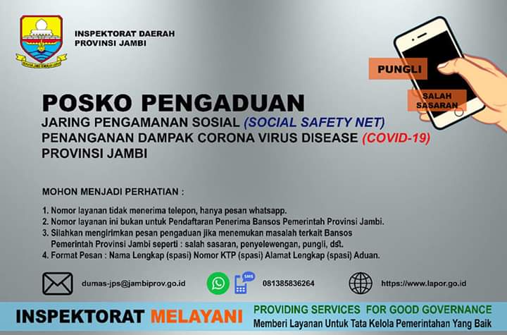 Layanan Posko Pengaduan ini, sudah disiapkan khusus oleh Pemprov Jambi. Hal ini guna mengawal penyaluran Bantuan Covid-19, agar dapat berjalan sesuai dengan aturan berlaku, dan tepat sasaran.