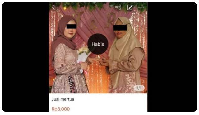 Ia memasang foto si menantu dan mertua yang tengah dalam sebuah rangkaian acara pernikahan. Dalam deskripsi produk iklan tersebut tertulis “Jual mertua“ dengan harga Rp. 3000.
