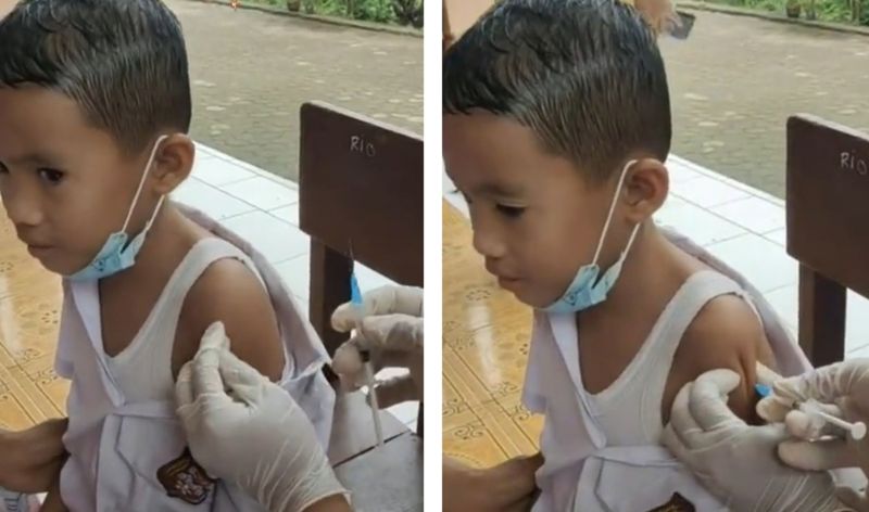 Dalam video yang di unggah pada 5 Maret 2022 oleh akun Twitter @alfajri221810, tampak seorang bocah yang terlihat santai saat akan menerima suntikan vaksinasi dari petugas kesehatan.