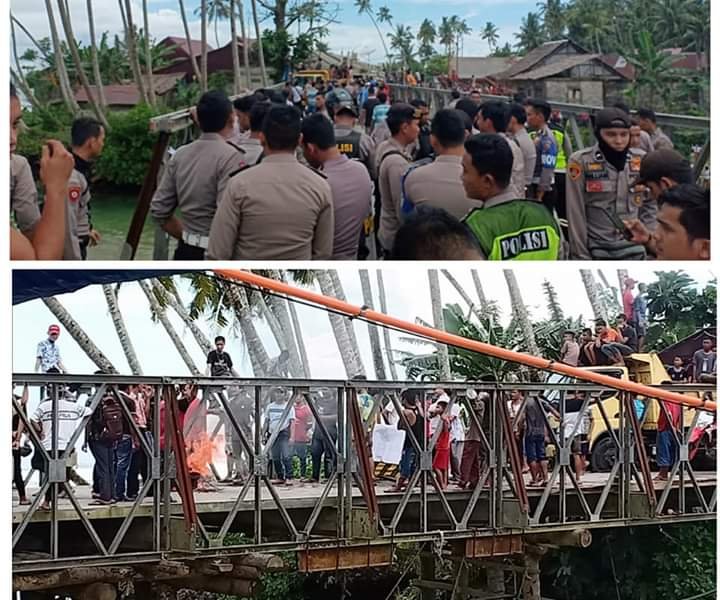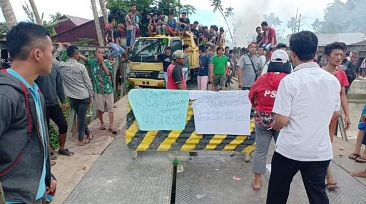 Aksi penghadangan menggunakan truk yang sengaja dipalang di Jembatan Geba Hilisataro Kecamatan Toma. Tampak juga sejumlah spanduk di lokasi aksi tersebut.