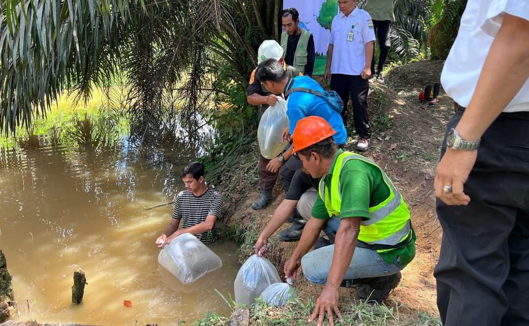 Selain menanam bibit buah-buahan, perusahaan BUMN ini juga menyebar benih ikan Jelawat sebanyak 8.000 ekor di kolam Pabrik Kelapa Sawit (PKS).