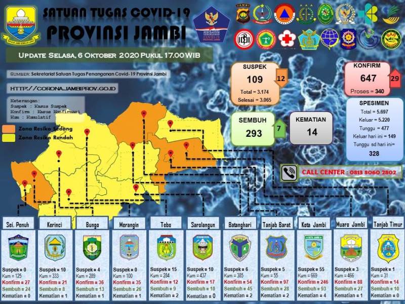 Berdasarkan hasil pemeriksaan swab konfirmasi Covid-19 di Provinsi Jambi tanggal 6 Oktober 2020 terdapat penambahan 29 positif. 23 diantaranya dari Kabupaten Muaro Jambi.