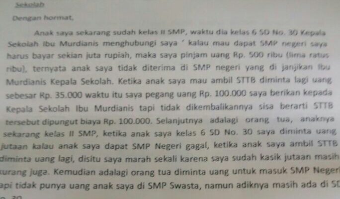 Untuk diketahui, kejadian seperti itu sudah terjadi dari beberapa tahun silam namun selalu dapat diredam, hal itu dibuktikan dengan beberapa kali surat pengaduan wali murid dilayangkan ke pihak Diknas Kota Jambi bahkan ke Walikota Jambi dan tidak mendapatkan tanggapan. (One)
