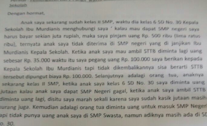 Bukan asal reka, hal itu terbukti dengan pengaduan dari ratusan wali murid kepada pihak Komite Sekolah pada 16 Oktober 2017 ini. Para wali murid mengaku mereka diperas oleh Kepala Sekolah mulai dari puluhan ribu rupiah hingga jutaan rupiah itu, merasa sudah tidak wajar dilakukan.