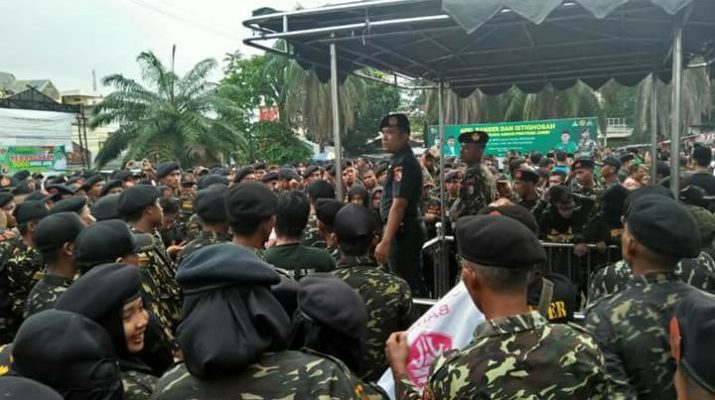 JAMBI – Ribuan Ansor Banser memadati pelataran Stadion KONI, mengikuti Apel Kebangsaan dan Istighosah Se-Provinsi Jambi, Sabtu (05/05) siang. Panasnya terik matahari, tak menghentikan semangat