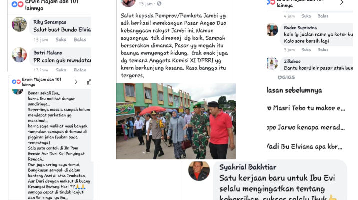 JAMBI – Dalam Postingan akun Facebook (FB) Elviana, Anggota DPR RI dari Komisi XI yang memuji keberhasilan Pemerintah Provinsi (Pemprov) dan Pemerintah Kota (Pemkot)