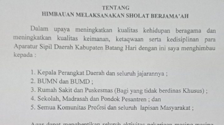 BATANGHARI – Bupati Batanghari Syahirsah SY telah mengeluarkan Surat Edaran tentang imbauan melakukan salat berjamaah. Surat bernomor 0427/Kesos/2019 itu ditandatangani langsung Bupati Syahirsah tanggal