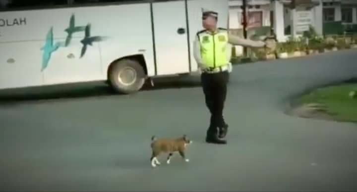 Kalau biasanya kita melihat polisi membantu orang menyebarang di jalan raya, kali ini beredar video polisi lalu lintas menyeberangkan seekor kucing.