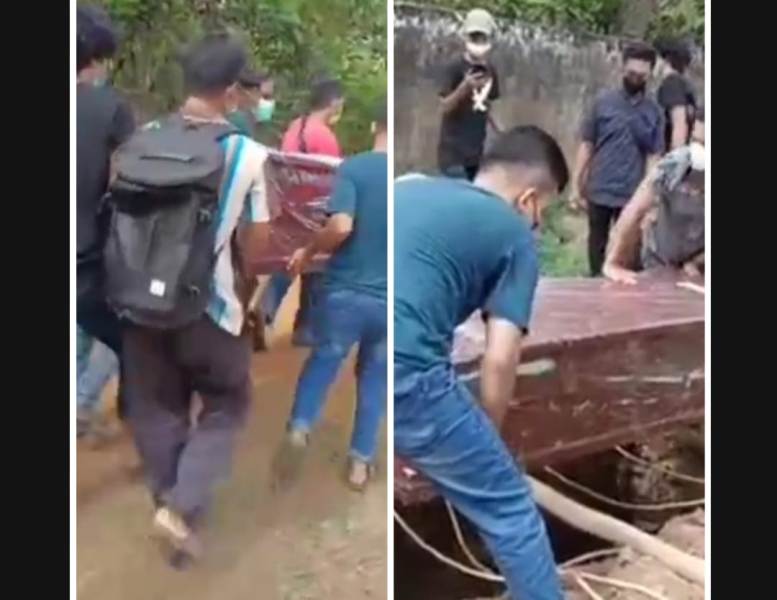 “Dibawa dari rumah sakit umum, cuman di letakkan di tengah jalan ini. Tak sampai pun ke lubang lahat,” katanya dalam video tersebut.