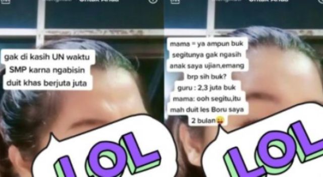“Mama: ‘Ya ampun buk segitunya nggak ngasih anak saya ujian, emang berapa sih buk?’ Guru: ‘2,3 juta buk’ Mama: ‘Oh segitu, itu mah duit les boru saya dua bulan’,” tulisnya menirukan percakapan guru dan ibunya.