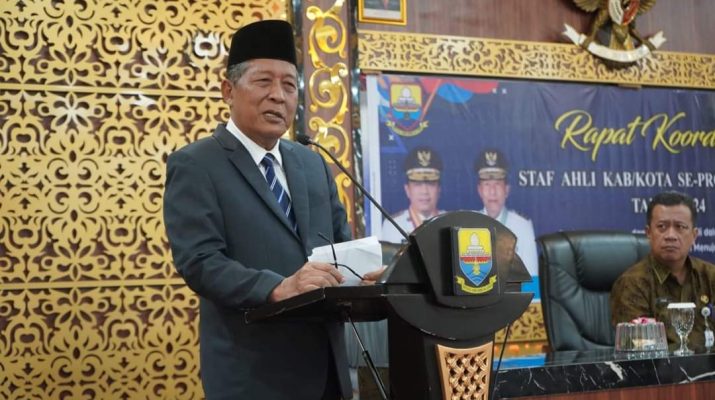 JAMBI – Wakil Gubernur Provinsi Jambi Drs. Abdullah Sani, M.Pd.I menyambut baik terselenggaranya Rapat Koordinasi (Rakor) Staf Ahli Kepala Daerah Se-Provinsi Jambi Tahun 2024 yang dinilai menjadi wadah silaturahmi dan berbagi pengalaman dan wawasan para Staf Ahli Kepala Daerah se-Provinsi Jambi dan diharapkan Rakor ini menjadi media bagi terwujudnya percepatan pencapaian Visi dan Misi Pembangunan Provinsi Jambi demi kemajuan dan kesejahteraan masyarakat.
